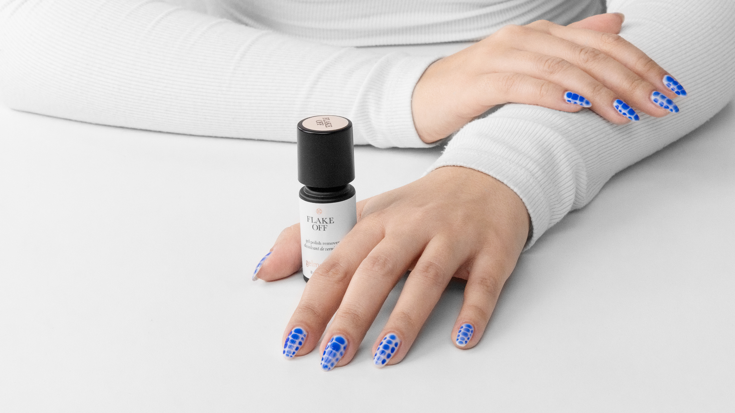 Gently buff shine off polished nails to allow flake off remover to work most effectively.